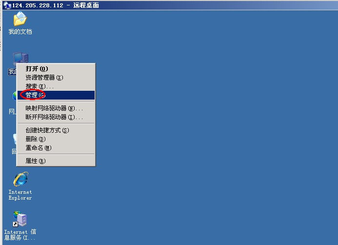 1、远程登录到vps云主机后,在桌面上右键我的电脑→管理,打开计算机管理面板。如下图